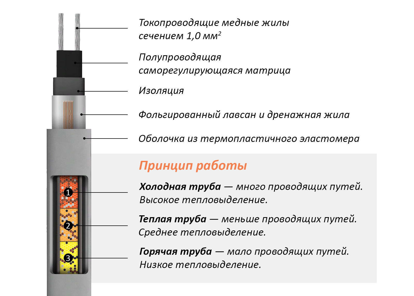 Нагрев происходит за счет прохождения электрического тока через полупроводящую саморегулирующуюся матрицу от одной токопроводящей жилы к другой. Матрица изменяет свое сопротивление в зависимости от температуры поверхности, на которую уложен нагревательный кабель. За счет этого обеспечивается эффект саморегулирования, то есть линейная мощность кабеля меняется в ответ на изменение температуры поверхности (при повышении температуры поверхности сопротивление матрицы увеличивается, мощность уменьшается и наоборот).