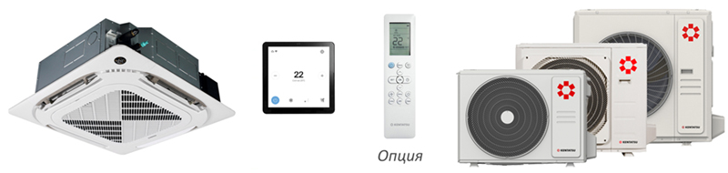 Кассетная сплит–система предназначена для установки в потолочную конструкцию скрытым или открытым способом. Подходит для офисов, кафе, ресторанов и других общественных помещений. Есть возможность организации приточной вентиляции для подмеса свежего воздуха в помещение. Кондиционер можно доработать зимним комплектом для эксплуатации в режиме охлаждения при низких уличных температурах до -40 °С.