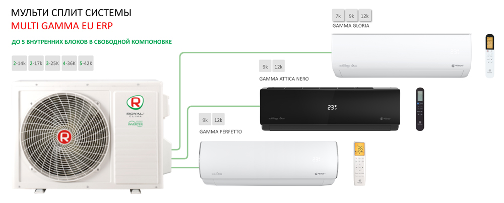 Новая современная серия мульти-сплит систем MULTI GAMMA позволяет подключить до 5 внутренних блоков серий GLORIA / ATTICA NERO / PERFETTO в свободной компоновке. Работает на новом экологичном хладагенте R32, имеет высокие показатели энергоэффективности (А/А++). Стабильная работа на охлаждение до -15 градусов, а на обогрев — до -20 градусов без дополнительных доработок.