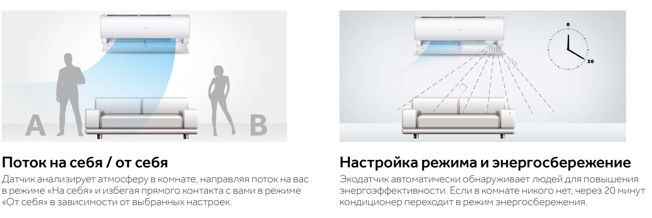 • Экодатчик — сенсор, определяющий наличие человека в помещении и его передвижения для создания максимально комфортного микроклимата. Если человек в помещении не обнаружен — спустя 20 минут автоматически включается режим энергосбережения.