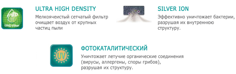 Комбинация из 3 видов фильтров эффективно очищает проходящий через кондиционер воздух, задерживая всевозможные загрязнители и делая воздух в помещении безопасным.