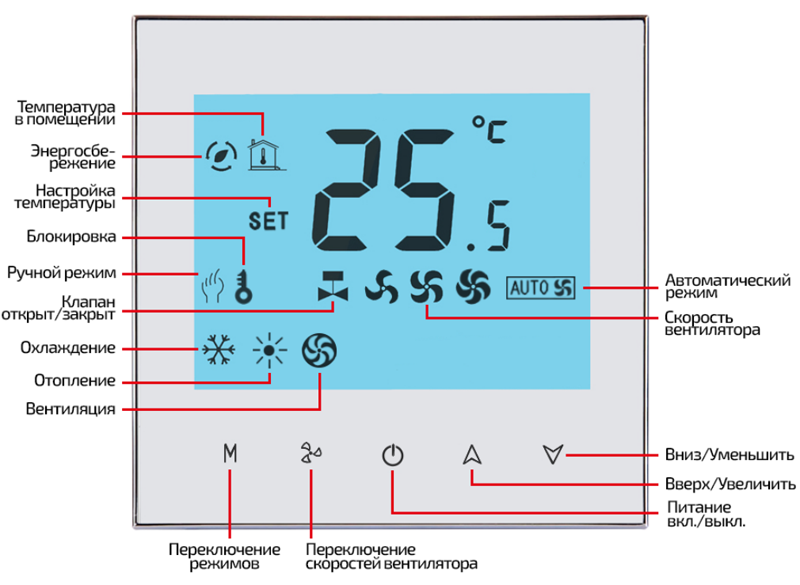 • Контроль температуры воздуха в помещении (через открытие/закрытие клапана или настройку производительности тепловентилятора);