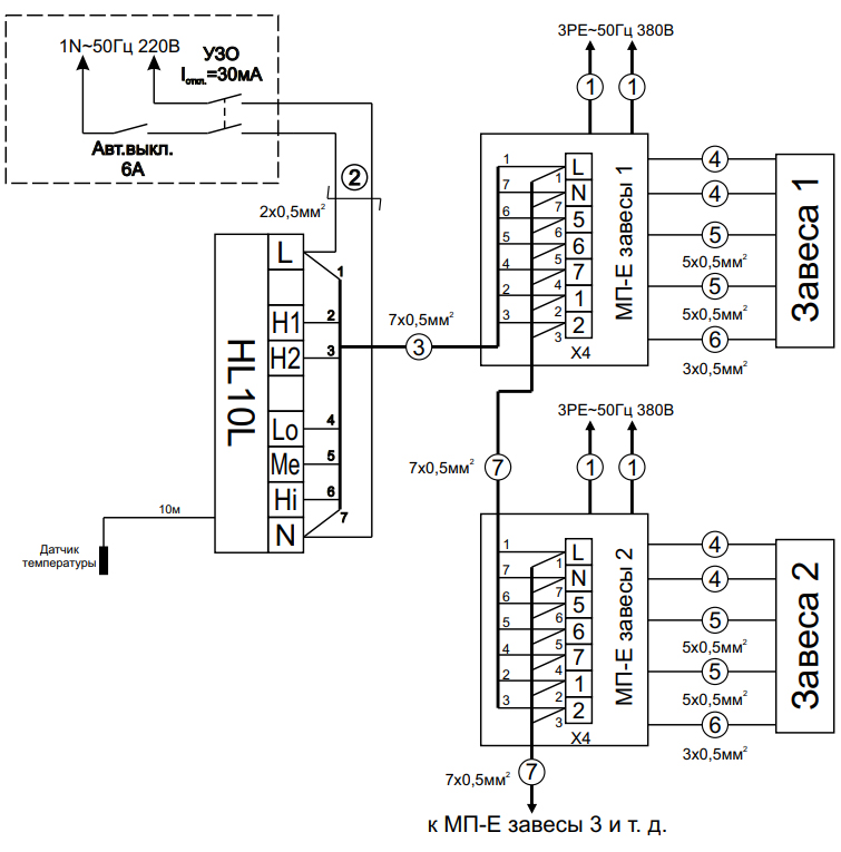 Схема подключения группы от двух до двадцати влагозащищенных завес к одному пульту управления HL10L