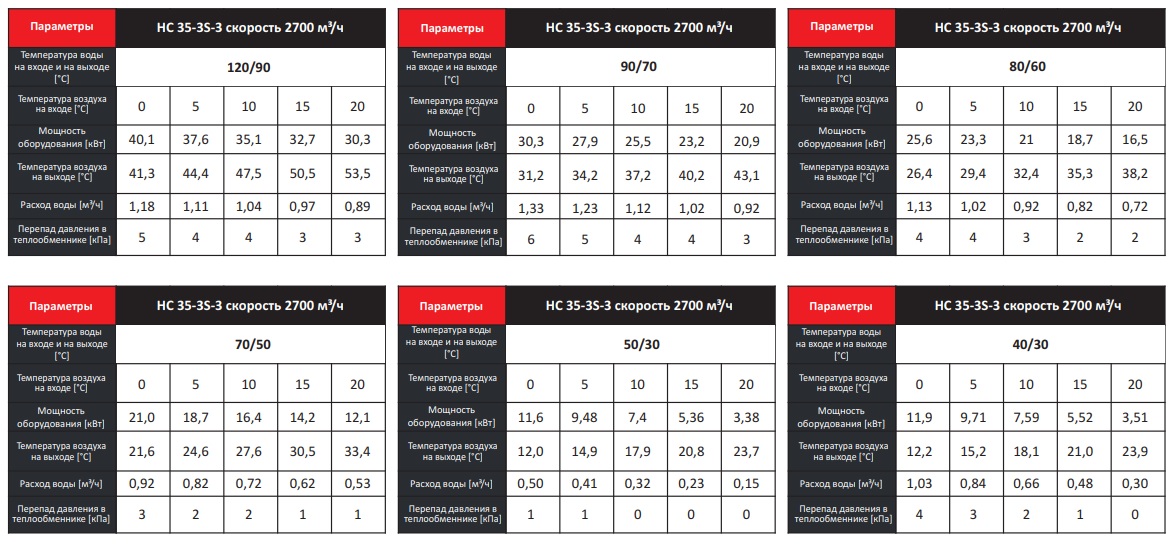 Тепловые характеристики приведены при температуре воздуха на входе +0 °С, максимальном расходе воздуха и максимальной температуре теплоносителя (указанной в таблице тепловой мощности от производителя).