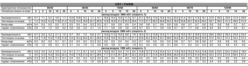 Тепловые характеристики приведены при температуре воздуха на входе +0 °С, максимальном расходе воздуха и максимальной температуре теплоносителя (указанной в таблице тепловой мощности от производителя).