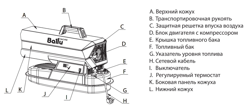 Предназначена для обогрева промышленных помещений и строительных площадок до 300 кв. м, работает на дизельном топливе. Устройство может работать в непрерывном режиме до 8 часов. Встроенный термостат позволяет эксплуатировать теплогенератор в температурных условиях от -10 °С до +45 °С. Электронное управление расположено на корпусе прибора. Объем топливного бака составляет 19 литров.