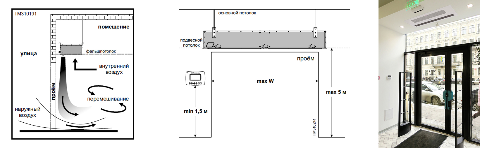 Тепловая завеса смесительного типа, создает нагретый воздушный поток, который смешивается с холодным уличным воздухом в пределах тамбура или вестибюля. Таким образом завеса препятствует проникновению холодного воздуха с улицы в помещение. Встраивается в подвесной или фальш-потолок над дверным проёмом, на высоте от 3 до 5 м. Устанавливаются в магазинах, офисах, ресторанах, гостиницах, бизнес центрах и т.п. Применяются, в основном, для защиты проемов, оборудованных тамбуром.